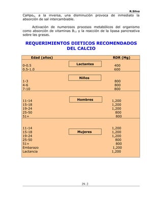 Este documento trata sobre los minerales calcio, fósforo y magnesio. Brevemente describe sus funciones biológicas principales, requerimientos dietéticos recomendados y fuentes alimenticias. También resume posibles trastornos por deficiencia o toxicidad de cada mineral.