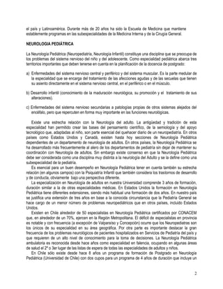 Este documento describe un programa de subespecialización médica en neurología pediátrica de la Pontificia Universidad Católica de Chile. El programa dura 4 años y tiene el objetivo de capacitar a médicos pediatras para que puedan ejercer la especialidad de neurología pediátrica de manera independiente. El programa incluye formación teórica y práctica en el hospital universitario y centros de salud asociados.