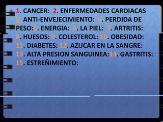 El documento enumera 30 razones para consumir Ganoderma lucidum (reishi), incluyendo sus beneficios para la salud como prevenir el cáncer, enfermedades cardíacas y la diabetes, mejorar la energía y la piel, y combatir enfermedades como la artritis, Alzheimer, Parkinson y VIH. También detalla 14 razones para consumir espirulina, destacando sus altos niveles de proteínas, hierro, vitaminas y minerales que son beneficiosos para la salud.
