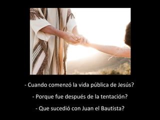 El documento resume las enseñanzas de Jesús al comienzo de su ministerio público. Explica que Jesús comenzó a predicar después de que Juan el Bautista fuera encarcelado, cumpliendo las profecías. Jesús predicaba sobre el arrepentimiento y el perdón de pecados. Curó a un paralítico para demostrar que tenía el poder de perdonar pecados. Llamó a Mateo a seguirle a pesar de su trabajo como recaudador de impuestos, y comió con pecadores para mostrar que vino a salvar a los que reconocen