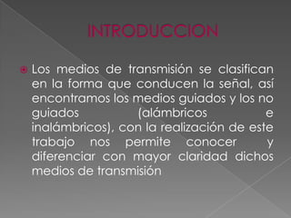 Este documento describe y compara diferentes medios de transmisión de datos, incluyendo medios guiados (cableados) como cable par trenzado y fibra óptica, e inalámbricos como microondas, satélites e infrarrojos. Explica las ventajas e inconvenientes de cada uno para su uso en comunicaciones.