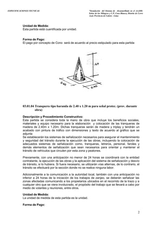 Este documento describe las especificaciones técnicas para la instalación de un sistema de alcantarillado en dos áreas de Lima. Incluye detalles sobre señalización de seguridad, cercos, letreros y pasos provisionales requeridos durante la obra, así como procedimientos para trazar, replantear y excavar zanjas para las tuberías.