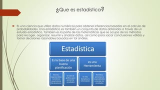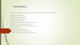 Este documento describe la estadística, incluyendo su definición, orígenes, tipos (descriptiva, inferencial y aplicada), elementos de recolección de información (entrevistas, encuestas, observación), importancia y aplicaciones en diferentes campos. También explica conceptos como probabilidad, técnicas de análisis estadístico (prueba de chi cuadrado, prueba de Kolmogorov-Smirnov) y disciplinas especializadas como estadística física y estadística matemática.
