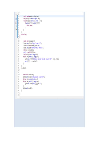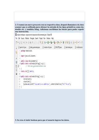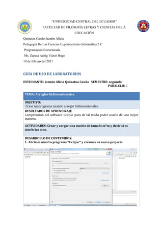 Este documento presenta una guía para un laboratorio sobre arreglos bidimensionales para un estudiante de segundo semestre de la carrera de Pedagogía de las Ciencias Experimentales e Informática. El objetivo del laboratorio es crear un programa que use arreglos bidimensionales para determinar si una matriz dada es simétrica o no. El desarrollo incluye abrir Eclipse, crear un proyecto y clase, usar bucles para ingresar los datos de la matriz, y ejecutar el programa para verificar los resultados.