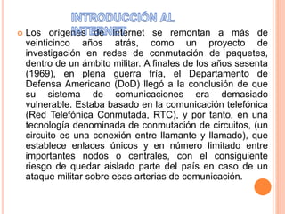 Los orígenes de Internet se remontan a 1969 como un proyecto militar estadounidense llamado ARPAnet que buscaba crear una red robusta capaz de funcionar aun si parte de ella fuera destruida. ARPAnet implementó con éxito la tecnología de conmutación de paquetes que permitía dividir y enviar la información de forma flexible. En 1974 se presentó el protocolo TCP/IP que permitió conectar distintas redes y dar lugar a la Internet actual.