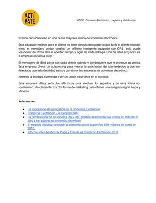 La logística y distribución son actividades cruciales para el comercio electrónico, ya que permiten la entrega del producto al cliente de manera óptima. Una logística deficiente puede dañar la experiencia del cliente y el proyecto de comercio electrónico en general. Las empresas deben cuidar detalles como los plazos de entrega, la información y el estado del pedido provisto al cliente, y la calidad del embalaje y entrega. Además, el uso de tecnologías como GPS y vehículos eléctricos
