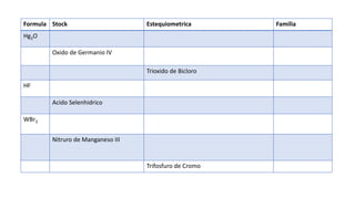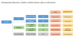 Este documento lista varios compuestos binarios, incluyendo su fórmula química, nombre común y familia química. Los compuestos binarios consisten en un catión y un anión que contienen solo un elemento cada uno. Algunos ejemplos mencionados son el trióxido de di titanio, el trióxido de azufre, el trihidruro de titanio y el ácido sulfhídrico.