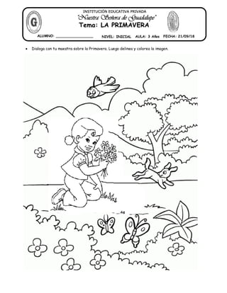 La actividad le pide al alumno dialogar con su maestra sobre la primavera, luego delinear y colorear la imagen de "Nuestra Señora de Guadalupe". La actividad es parte de una unidad sobre la primavera para alumnos de 3 años de edad en el nivel inicial de la Institución Educativa Privada.