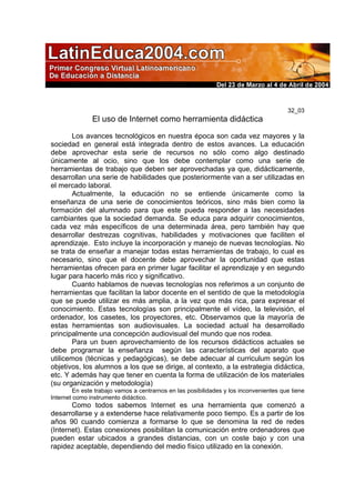 El documento discute el uso de Internet como herramienta didáctica en la educación. Señala que Internet ofrece grandes posibilidades de información y formación para los estudiantes. Sin embargo, también plantea desafíos como la necesidad de orientar a los estudiantes para que no se pierdan con tanta información disponible y la necesidad de capacitar a los profesores para aprovechar mejor estas herramientas.