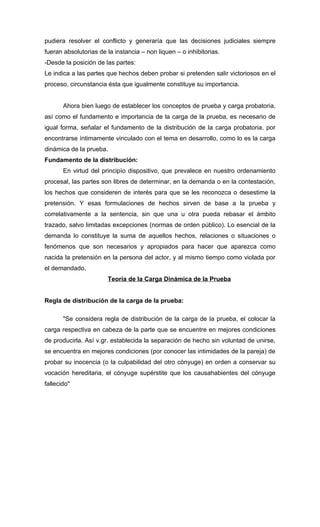 El documento discute la carga de la prueba y la teoría de la carga dinámica de la prueba. Explica que la carga de la prueba indica qué parte debe probar los hechos en disputa y qué sucede si no se presenta prueba. La teoría de la carga dinámica sostiene que la carga de la prueba debe recaer en la parte que esté en mejor posición para presentarla. El documento también analiza la aplicación de esta teoría en casos de responsabilidad médica.
