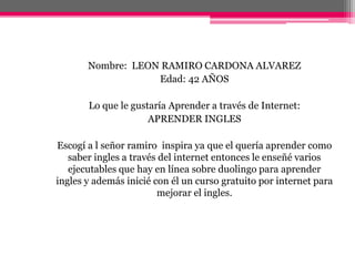 Este documento describe cómo un estudiante ayudó a Ramiro Cardona Alvarez, de 42 años, a aprender inglés a través de Internet. El estudiante le enseñó aplicaciones como Duolingo y un curso gratuito en línea. También tuvieron clases extra en la escuela para practicar el idioma. Gracias a estas lecciones, el señor Ramiro ha mejorado su acceso a Internet y ahora puede hablar algunas palabras en inglés.