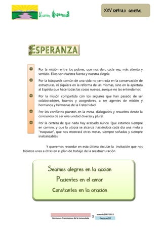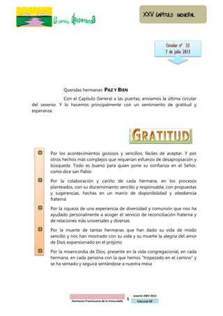 Este documento es una carta circular de las Hermanas Franciscanas de la Inmaculada para el período 2007-2013. Expresa gratitud por los eventos y procesos del período, incluida la colaboración de las hermanas, la diversidad y comunión dentro de la congregación, el servicio a los pobres, y los desafíos resueltos a través del diálogo. También invita a las hermanas a ponerse a disposición del nuevo gobierno general y de los pobres de cara al próximo capítulo general.