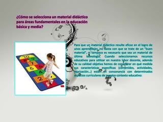 Para seleccionar un material didáctico eficaz, se debe considerar si sus objetivos, contenidos y características se alinean con los objetivos educativos, contenidos y características de los estudiantes del contexto educativo. Además, la selección debe hacerse como parte del diseño de una intervención educativa específica que incluya estrategias didácticas y actividades de aprendizaje que aseguren el logro de los aprendizajes previstos. Para aplicar un material didáctico, es importante asegurar el apoyo tecnoló