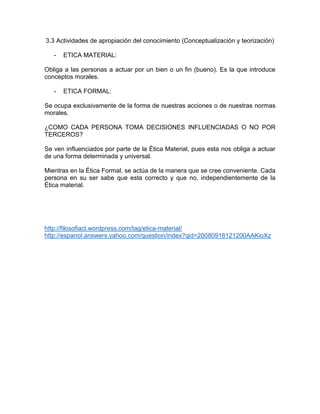 La ética material introduce conceptos morales y obliga a las personas a actuar por un bien o fin bueno, mientras que la ética formal se ocupa exclusivamente de la forma de nuestras acciones o normas morales. Cada persona puede verse influenciada o no por la ética material al tomar decisiones, dependiendo de si actúa de acuerdo a una forma universal determinada o de acuerdo a lo que cree conveniente de manera independiente.
