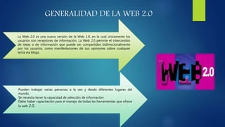 El documento describe la evolución de la web de 1.0 a 2.0, destacando la importancia del intercambio bidireccional de información y la colaboración entre usuarios. Expone los principales servicios web 2.0 utilizados en educación y la relevancia de las redes sociales, ejemplificadas por Facebook. Además, analiza el almacenamiento en la nube, sus ventajas y desventajas, así como el impacto de los dispositivos móviles en la forma de acceder a estos servicios.