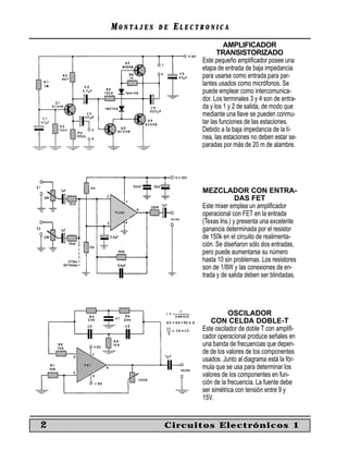 El primer documento describe un circuito para atraer peces usando un micrófono magnético. El segundo presenta un amplificador de 1/2W para sistemas de intercomunicación. El tercer circuito es un amplificador con ganancia de 1000 usando un operacional.