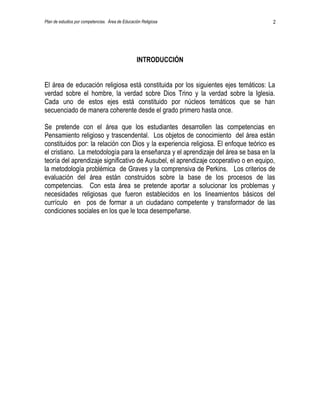 Este documento presenta el plan de estudios del área de Educación Religiosa. Resume los objetivos generales del área, que son construir las competencias de pensamiento religioso y trascendental para mejorar la formación espiritual. Explica que el área contribuye al desarrollo integral de los estudiantes y al logro de los fines de la educación a través de la enseñanza de valores y la formación de una conciencia social. Finalmente, presenta los referentes teóricos del área, incluyendo los objetos de conocimiento, aprend