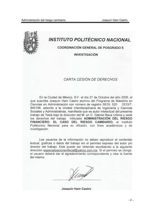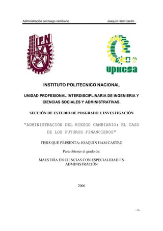 Este documento trata sobre la administración del riesgo cambiario a través del uso de futuros financieros. Analiza el mercado cambiario y sus riesgos, así como los diferentes participantes. Presenta un caso común de una empresa mexicana que importa insumos estadounidenses, enfrentando un riesgo cambiario. Evalúa tres alternativas para administrar este riesgo, concluyendo que el uso de futuros cambiarios permite fijar precios, tipo de cambio y provee apalancamiento sin usar recursos propios.