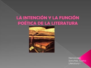 La intención comunicativa de la literatura puede ser informar, persuadir u apelar a los lectores. La función poética se concentra en el mensaje mismo y crea un vínculo especial con el lector. Existen diferentes marcas de literalidad como el lenguaje literario y las formas de presentación de la información. El manejo del lenguaje incluye figuras retóricas como la onomatopeya, hipérbole y antítesis en los planos técnico, monofosintético y léxico semántico.
