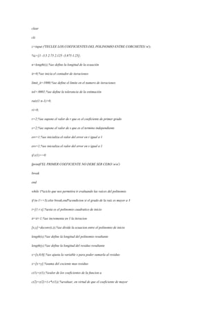 El Método de Bairstow es un algoritmo eficiente para encontrar las raíces de un polinomio de grado arbitrario utilizando solo aritmética real. Funciona ajustando los coeficientes de un polinomio cuadrático hasta que sus raíces también sean raíces del polinomio original, permitiendo determinar las raíces de forma iterativa hasta resolver el polinomio completamente.