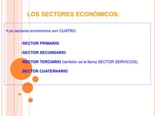 Los cuatro sectores económicos son el primario, que obtiene productos de la naturaleza; el secundario, que transforma esos productos; el terciario, que ofrece servicios; y el cuaternario, que incluye servicios intelectuales de alta tecnología. Cada sector incluye varios grupos de actividades clave como la agricultura, la ganadería y la minería en el primario, y la industria, la construcción y los servicios en los otros sectores.
