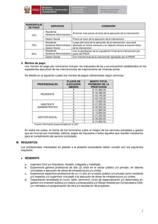 Este documento convoca a profesionales para registrarse y ser contratados por núcleos ejecutores del Programa Nacional de Vivienda Rural para realizar intervenciones de mejoramiento de vivienda social en varias regiones del Perú. Se detallan los requisitos para residentes, gestores sociales y asistentes administrativos, así como el cronograma del proceso de convocatoria y selección.