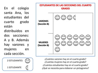 El documento presenta información sobre los estudiantes de cuarto grado de una escuela divididos en dos secciones, A y B. Se indica que hay varones y mujeres en cada sección, pero no se especifican las cantidades. También incluye una explicación breve de lo que es un pictograma y cómo se elabora uno a partir de datos recolectados.