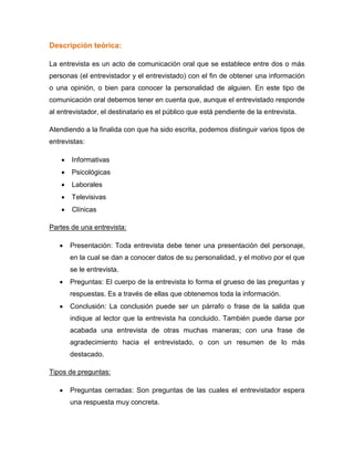El documento describe los conceptos clave de una entrevista, incluyendo su definición como un diálogo entre dos o más personas para obtener información, y las partes principales de una entrevista como la presentación, preguntas y conclusión. También explica los tipos de preguntas que puede hacer un entrevistador, como preguntas abiertas, cerradas e hipotéticas. El objetivo es familiarizar a los estudiantes con las entrevistas laborales para mejorar su confianza.