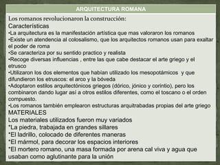 El documento proporciona información sobre la historia, cultura y arquitectura de la antigua Roma. Brevemente describe la fundación de Roma según la leyenda de Rómulo y Remo, y luego resume los principales aspectos geográficos, culturales, económicos y políticos de la época. También resume los principales órdenes arquitectónicos romanos y varios importantes edificios como el Coliseo, el Foro Romano, las basílicas y las termas.