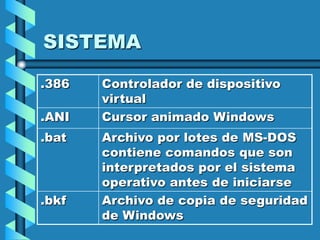 Este documento lista y describe brevemente los tipos y extensiones comunes de archivos, agrupados por categoría como sistema, sonido, video, comprimidos, imagen y texto. Incluye extensiones populares como .exe, .dll, .bat, .jpg, .mp3, .zip, .doc entre otras, y provee una breve descripción de cada una.