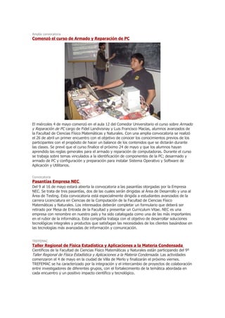 El boletín resume varios eventos y noticias de la Universidad Nacional de San Luis, incluyendo un curso sobre negociación, un curso de armado y reparación de PC, pasantías ofrecidas por la empresa NEC, y una conferencia sobre almacenamiento de hidrógeno en materiales porosos.