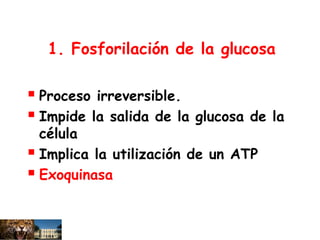 La glucólisis consta de 10 etapas que convierten la glucosa en piruvato, produciendo ATP y NADH en el proceso. La glucosa se fosforila de manera irreversible en la primera etapa. Luego se convierte en fructosa-6-fosfato y luego en fructosa-1,6-bifosfato. Esto se escinde en dos triosas fosfatadas, iniciando la fase de carga energética donde se producen ATP y NADH. Las triosas se interconvierten y se oxidan, produciendo más ATP y NADH