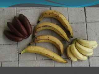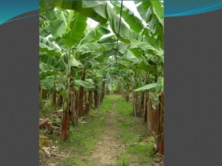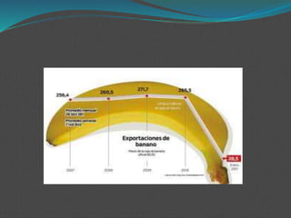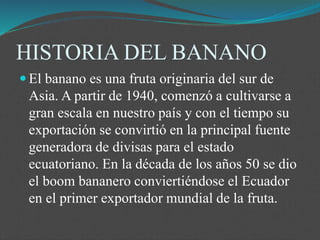 El documento proporciona información sobre la producción y comercio del banano en Ecuador. Explica que Ecuador fue el principal exportador mundial de banano en las décadas de 1950, y que actualmente el banano es el segundo producto de exportación más importante del país. También describe los principales tipos y variedades de banano cultivadas, así como los principales países productores y consumidores a nivel mundial.