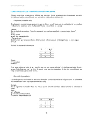 Este documento introduce conceptos básicos de lógica matemática, incluyendo proposiciones, conectivos lógicos, tablas de verdad y métodos de demostración. Define una proposición como una oración que puede ser verdadera o falsa, pero no ambas a la vez. Explica los conectivos lógicos de conjunción, disyunción y negación y cómo se usan para formar proposiciones compuestas. También cubre proposiciones condicionales y bicondicionales con sus tablas de verdad correspond