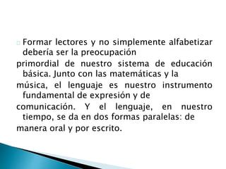 El documento argumenta que la educación básica debería enfocarse en formar lectores más que simplemente enseñar a leer. Explica que cuando se realizó un estudio de comprensión lectora en tres preparatorias, el nivel de los estudiantes era equivalente al de niños de tercer grado primaria, lo que muestra que una vez que aprenden a leer ya no se les enseña a ser lectores. Resalta la importancia de leer en voz alta con los estudiantes, ponerles a disposición una variedad de libros, alent