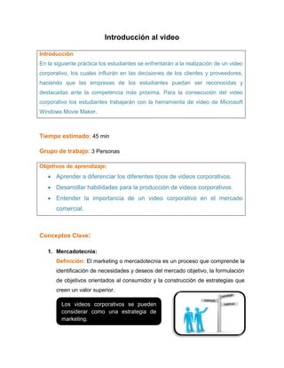 Este documento introduce los videos corporativos y proporciona instrucciones para que los estudiantes creen uno para sus propias empresas ficticias usando Windows Movie Maker. Explica que los videos corporativos pueden influir en las decisiones de clientes y proveedores y destacar una empresa sobre su competencia. También define conceptos clave como mercadeo, visión, misión y objetivos, y describe diferentes tipos de videos corporativos como de imagen, procesos y testimoniales.