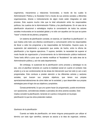 Este documento presenta una introducción a la planificación. Define la planificación como un proceso continuo de elaboración de planes y programas, así como una estrategia que tiene en cuenta a los diferentes actores sociales. Explica que la planificación implica analizar la realidad, tomar decisiones racionales para alcanzar objetivos, y coordinar acciones de manera eficiente. Finalmente, destaca algunas características clave de la planificación como un proceso preparatorio de decisiones futuras dirigidas a lograr objetivos a través de medios preferibles.