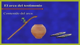 El documento detalla la construcción y la importancia del Arca del Pacto según el Éxodo, especificando sus dimensiones, materiales y la presencia de elementos sagrados en su interior. También se discuten eventos históricos en los que el Arca jugó un papel clave, así como su simbolismo en la relación entre Dios y el pueblo de Israel. Se menciona cómo el Arca fue buscada, venerada y considerada un testimonio del poder divino, a pesar de no poseer poder en sí misma.