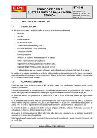 Este documento establece las normas y especificaciones técnicas para el tendido de cables eléctricos subterráneos de baja y media tensión en la provincia de Santa Fe, Argentina. Detalla los requisitos para la excavación de zanjas, colocación de cables, protección de los mismos y reposición de veredas y pavimento. Las tareas incluyen sondeos previos, tendido de cables a mano o máquina respetando radios de curvatura, y colocación de protecciones como ladrillos y placas.