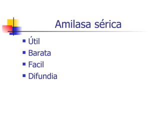 Este documento resume las pruebas de laboratorio útiles para diagnosticar pancreatitis aguda y crónica. Para la aguda, la amilasa y lipasa séricas son útiles pero la lipasa es más sensible y específica. La tripsina, calcio y proteína C reactivas también son indicadores. Para la crónica, las pruebas invasivas midiendo la secreción pancreática son el estándar de oro, aunque también se usan pruebas no invasivas como medir la grasa fecal.