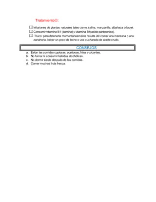 Este documento describe la acidez de estómago o pirosis, incluyendo sus síntomas como dolor estomacal, flatulencias y acidez, causas como gastritis, hernia de hiato y debilitamiento de la válvula esofágica, y tratamientos naturales como infusiones de plantas, vitaminas y evitar comidas copiosas.
