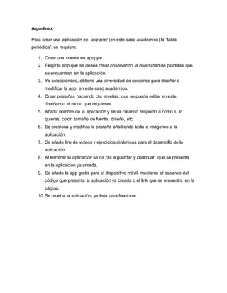 El documento describe los 10 pasos para crear una aplicación en la plataforma Apppypie, incluyendo crear una cuenta, seleccionar una plantilla, diseñar pestañas y añadir texto, imágenes, videos y ejercicios. Una vez completada, la aplicación se guarda y puede descargarse en dispositivos móviles mediante un código o enlace para su uso.