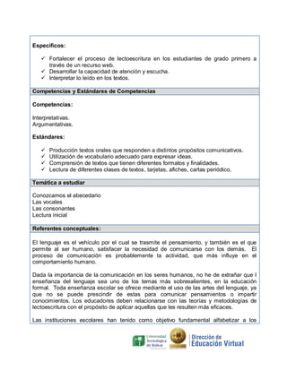 Este proyecto pedagógico de un mes de duración utilizará las TIC para mejorar el proceso de lectoescritura en estudiantes de primer grado. El proyecto incluirá tres actividades para familiarizar a los estudiantes con el abecedario, las vocales, las consonantes y la lectura inicial a través de recursos digitales como un CD interactivo. El proyecto evaluará el aprendizaje de los estudiantes a través de la auto-evaluación, co-evaluación y hetero-evaluación.