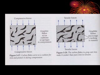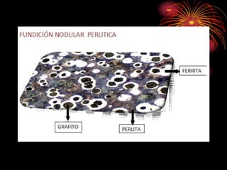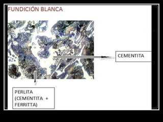 Este documento describe diferentes tipos de fundiciones clasificadas según su microestructura. Incluye fundición blanca, gris, nodular y maleable. Explica que las fundiciones contienen hierro, carbono y silicio, y que el carbono puede encontrarse como cementita o grafito. También cubre los efectos de los elementos de aleación y las propiedades generales de las fundiciones.