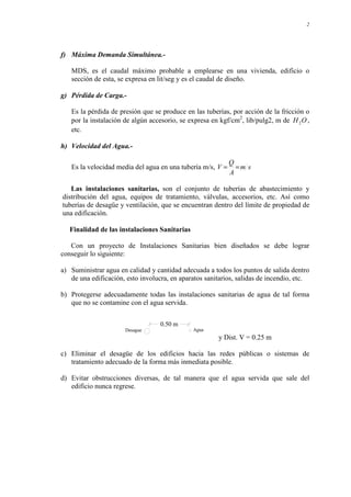 Este documento proporciona información general sobre instalaciones sanitarias. Explica conceptos clave como consumo de agua, máxima demanda, sistemas de abastecimiento y desagüe. También define términos como cantidad de agua, consumo, gasto, dotación y demanda. Finalmente, describe los materiales y accesorios comúnmente usados en instalaciones sanitarias como tuberías, válvulas y aparatos sanitarios.