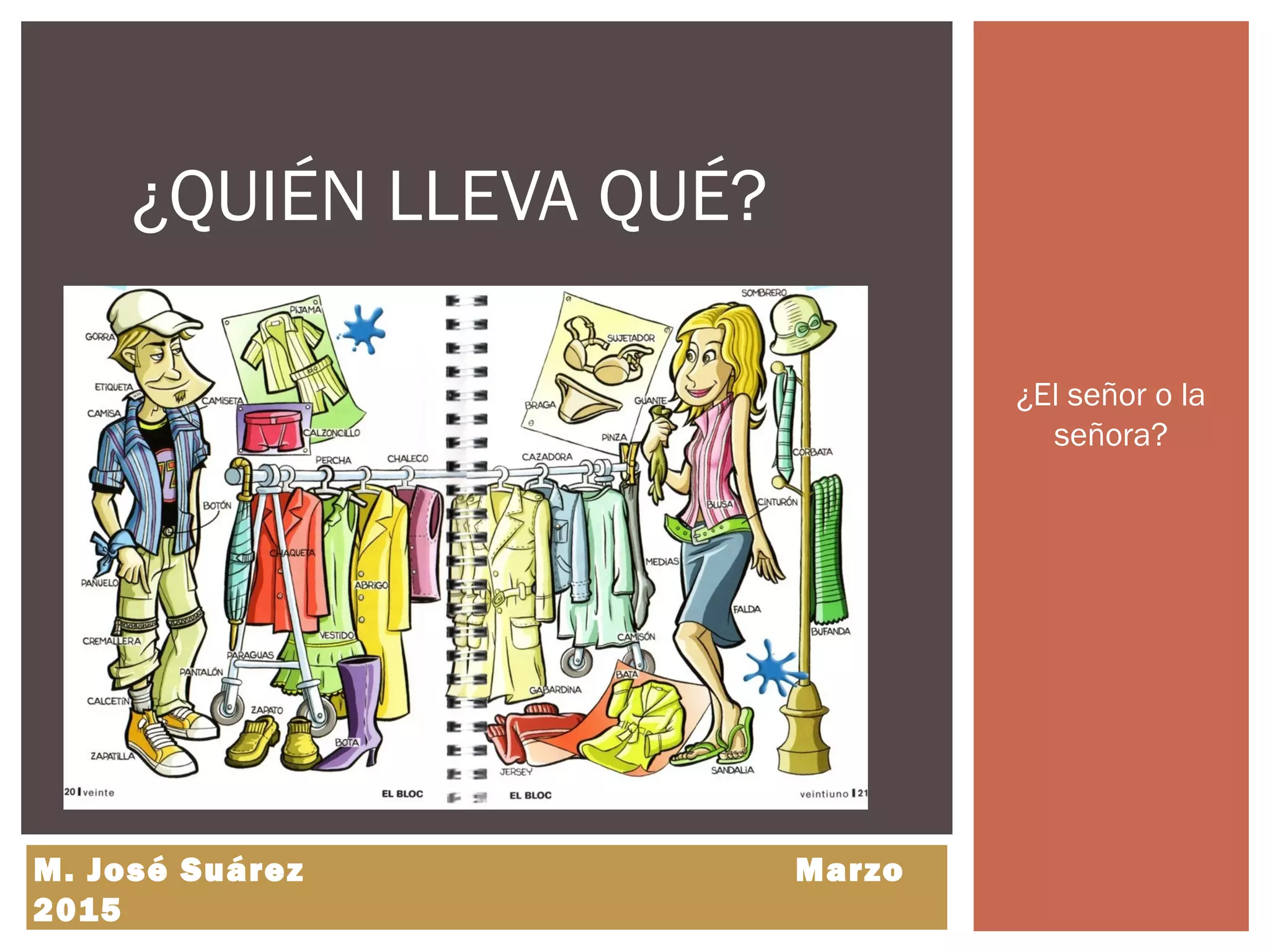 Este documento presenta una serie de preguntas sobre qué artículos de ropa llevan el señor y la señora para practicar el uso del verbo "llevar" y el acuerdo de género y color en español. Las preguntas describen diferentes prendas de vestir y accesorios y piden identificar si el señor o la señora los lleva.