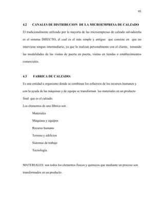 Este documento describe la organización y procesos de producción típicos de una microempresa de calzado en El Salvador. La microempresa tiene una estructura organizacional simple con dos niveles jerárquicos: el dueño y los obreros que se dividen en alistadores y ensueladores. El proceso de producción incluye el alistado de la parte superior del zapato y el ensuelado. La microempresa fabrica diferentes tipos de calzado para diferentes clientes usando varios métodos como el pegado, cosido o procesos de inyección.