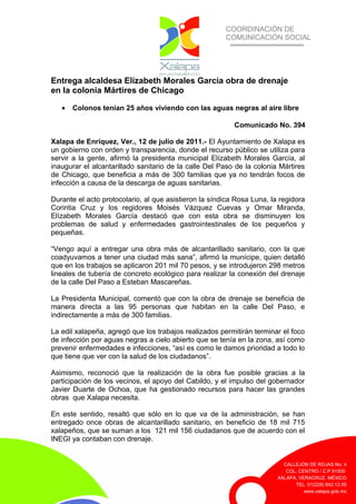 La alcaldesa Elízabeth Morales García inauguró una obra de drenaje en la colonia Mártires de Chicago de Xalapa que beneficiará a más de 300 familias al eliminar focos de infección de aguas negras. La obra costó 201,070 pesos e instaló 298 metros de tubería para conectar el drenaje de la calle Del Paso. Los vecinos agradecieron la obra, ya que algunos habían vivido con aguas negras al aire libre durante más de 25 años.
