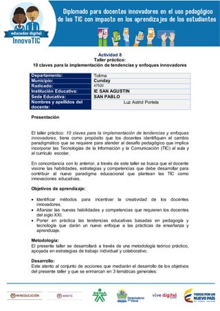 Este documento presenta un taller práctico sobre 10 claves para la implementación de tendencias y enfoques innovadores. El taller busca que los docentes identifiquen el cambio necesario para incorporar las TIC al aula y currículo. Se describen 3 temáticas generales: 1) Nuevas habilidades del siglo XXI, 2) Políticas de acceso a TIC, y 3) Desafíos de la educación. Incluye ejercicios para analizar tendencias pedagógicas, políticas nacionales sobre innovación y proponer 10 claves educativ