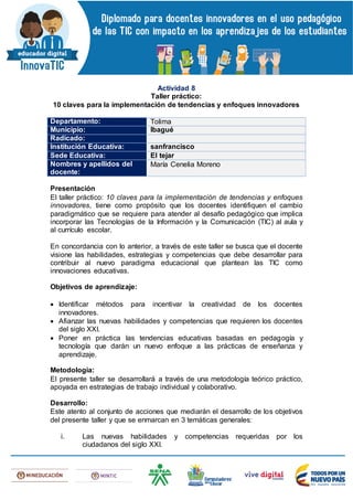 Este documento presenta un taller práctico sobre la implementación de tendencias y enfoques innovadores en la educación. El taller busca que los docentes identifiquen el cambio necesario para incorporar las TIC al aula y currículo escolar. El taller se centra en las nuevas habilidades del siglo XXI, políticas de acceso a la tecnología y los desafíos de la educación actual. Los docentes analizan tendencias educativas como el aprendizaje basado en proyectos, vivencial, invertido, basado en retos y flexible para identificar